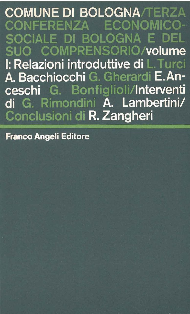 Terza conferenza economico - sociale di Bologna e del suo comprensorio. Volume I. Relazioni introduttive di L. Turci, A. Bacchiocchi, G. Gherardi, E. Anceschi, G. Bonfiglioni. Interventi di G. Rimondini, A. Lambertini. Concluzioni di R. Zangheri