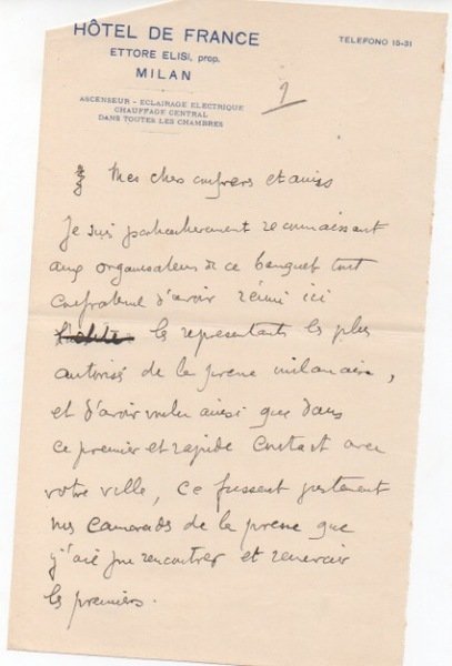 - Manoscritto di 9 pagine; inchiostro nero su carta intestata «Hotel de France / Milan»; testo in francese con correzioni e cancellature.