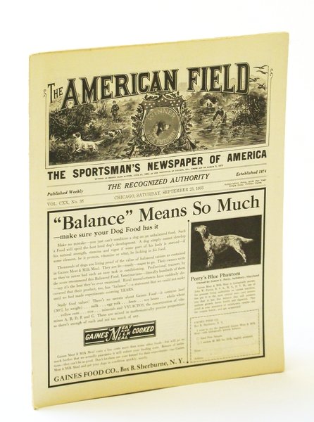- The American Field - The Sportsman's Newspaper [Magazine] of, America, September 23, 1933, Vol. CXX, No. 38 - All-America Prairie Chicken Trials Trego The Coming, Storm Ichaway Norias Roy Jr.Evergreen Jersey Mack Village Lad, Village Scout Glendale Madam Queen Keystone Hank My Man Groton, Frank Show Boat Travel Air J.W. King Florida-Collier Coast and, Associated Hotels Ad Sport Magazine Back Issues