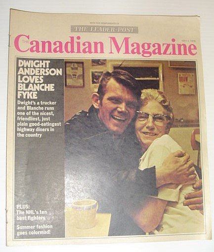 - The Canadian Magazine, May 2, 1970 *COVER PHOTO OF DWIGHT ANDERSON AND BLANCHE FYKE* Seven, Best Highway Diners in Canada - Parkside Service Centre, Maberley, Ontario - Kanaka Bar Restaurant, Lytton, BC - Helen's Coffee Shoppe, DeWinton, Alberta - Headingley Husky Travelcentre - Headingly, Manitoba, Gil's Truck Plaza, Quebec City - Valley Restaurant, Saint-Basile, New Brunswick - Blanche's Grill, Moosomin, Saskatchewan, Miss Nude America. is a Canadian, Dianne Boisclair, Colour ad for GM Pontiac models - Firebird, Le Mans, Grand Prix, The NHL's Ten Best Fighters - John Ferguson, Gordie Howe, Bobby Hull, Bobby Orr, Orland Kurtenbach, Ted Harris, Reggie Fleming, Eddie Shack, Derek Sanderson, Jim Dorey, Shades of Captain Marvel - fashion, Nice colour Hush Puppies ad, Nothing succeeds like failure - ask Marvin Fleishman of, auctioneer Danbury Sales Ltd, Rebuilding a wreck and restoring a memory - an HS-2L flying boat, and Don Foss, The Things you didn't know about Nature, Maggie Grant, Doug Wright's Family Food and Drink Canadiana Magazine Back, Issues