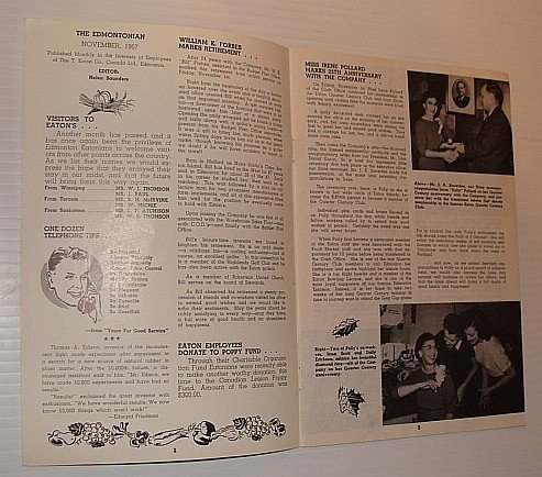 - The Edmontonian, November 1957 - Published monthly in the interests of employees, of the T. Eaton Co., Western Ltd., Edmonton William K. Forbes marks retirement, Miss Irene Pollard marks 25th anniversary with company, Leila Kerr Marries, Paintings by Rudolf Anton Messner displayed at Eatons, Good Deeds Clup Haloween Party - text and photos, Passing of Mrs. Gussie Campbell, Murray W. Wickham Edmonton Eskimos Cfl Football Canadiana, Magazine Back Issues Alberta