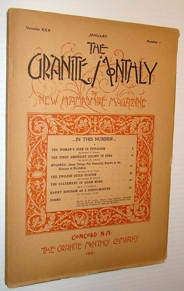 - The Granite Monthly - A New Hampshire Magazine - January 1901, Prescott Pianos ad inside front cover, The Woman's Club of Penacook, The First American Colony in Cuba - Neuvitas - great article, with photos, Bygones - Some Things not Generally known in the history of, Northfield, The English Guild System, The Statement of Adam More, Harry Bingham as a Schoolmaster, Poems, Nice full-page photo ad for the First National Bank in Concord, N.H., New Hampshire Necrology Americana History Magazine Back Issues