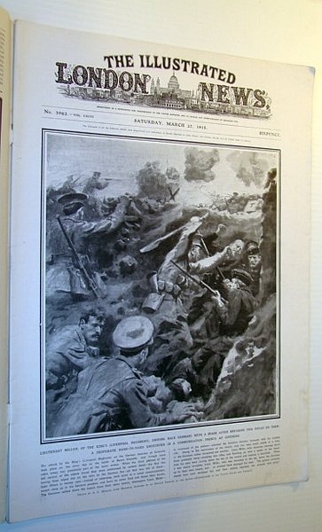 • The Illustrated London News, 27 March 1915 Lieutenant Miller of the King's (Liverpool, Regiment) driving back Germans at Givenchy, Przemysl - Fallen to the Russians after a Long Seige, Illustration of how the enemy's mines float downstream resulting, in the loss of battle-ships in the Dardanelles, Photos of Lord Kitchener at Liverpool and Manchester Parades, Two-page illustration by Richard Caton Woodville depicts an, heroic attack by the King's (Liverpool Regiment) on German, trenches, Photos of City (London) Volunteers as the National Guard marches, to the Palace, Large photo of an unexploded german 42 cm. Howitzer shell, Two-page spread with photos, names and ranks of dozens of British officers killed in action, Two-page illustration by John de G. Bryan depicting the gallant, attack on the Givenchy Ridge which contributed to the Neuve, Chapelle Victory, Interesting photo-illustrated article on the disinfection of, wounds, Fight for the Narrows - three photos including one of the French, battle-ship "Bouvet" before it was lost to a mine, Photos of five ships prior to their being lost or damaged -, H.M.S. Inflexible, the French battleship Gaulois, H.M.S. Irresistable, H.M.S. Ocean and the German cruiser Karlshruhe, Wonderful full-page illustrated at for Buchanan's Scotch, Whiskies shows food ship coming up the Thames at night, Touching full-page Oxo ad shows commrades at the bedside of a, wounded friend in Northern France, Beecham's Pills ad inside back cover, Wana-Ranee (Ceylon Perfume) History Military Magazine Back, Issues
