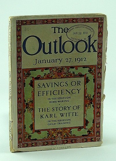 - The Outlook Magazine, January 27, 1912, Volume 100, Number 4 The Church and the People, The Adventure of Being Human, The Passing of a Brigadier, Judson Harmon - His Record and His Views, Savings or Efficiency? - second article on home making series, The Woman Spoke - article on native americans with quote by, Chief Iron Eye of the Omahas, Art and the Average Man, Teaching Our Soldiers to Shoot - photo-illustrated article, The Story of Karl Witte - first of a series of articles on the, progress and training of the child, Yankee Doodle in the style of the classical composers, From Stage Coach to Motor Car - great photo-illustrated article, on early motoring. Many wonderful vintage ads including a great, one-page ad for Rexall "93" Hair Tonic, Heinz Soup, Post Toasties, 2-page ad for R.M. Owen & Co., Reo Motor Car Co. featuring Reo the Fifth, Quaker Oats - with photo of Prof. A.P. Anderson "The Man Who, Invented Foods Shot From Guns", Educator Crackers, Van Camp's Pork and Beans, Dioxogen, Cheney Silks, Strathmore Paper, Hotel Chamberlin (Virginia), Santa Fe California Limited, Hamburg American Line ad for West Indies Cruise, Pebeco Toothpaste, Ostermoor Mattresses, Mott's Plumbing, The Columbia Buggy Company - featuring the self-starting 1912, Model 68-D, The Buick Model 35, Diamond Tires, American Woolen Company Native Peoples Firearms Magazine Back, Issues