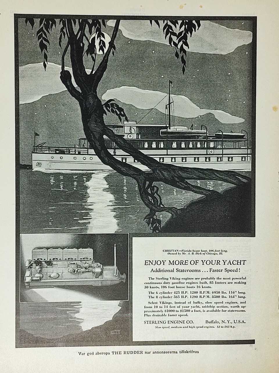 Vol. XLVI - No. 8 (August 1930). Lingua del testo: inglese. Formato: 24 x 30 cm circa. Pagine: 144 + [1]. Numerosissime immagini fotografiche e disegni in nero nel testo. Numerosi anche gli inserti pubblicitari (riguardanti il tema della nautica) illustrati nello stile tipico dell'epoca. Stato di conservazione: strappi (e piccole mancanze) sul dorso ma, nel complesso, un buon esemplare. Privo di scritte o altri segni nel testo. Nessuno strappo, ritaglio o mancanza all'interno. E' presente un ampio articolo (di tre pagine) dedicato alla 'DOLPHIN, A FAST DAY CRUISER' corredato da disegni in nero e dalla presenza di una tavola fuori testo (ripiegata una vilta su se stessa a causa delle sue grandi dimensioni) titolata 'Dolphin - a 27 Foot Day Cruiser designed especially for the Rudder by W. F. Crosby' con il prospetto dell'imbarcazione. segnaliamo, poi, la sezione 'Deisgns', con descrizioni e prospetti (disegni / sezioni) delle varie imbarcazioni, dedicata a: 1- The Motor Yacht Virginia; 2- A Rhodes Diesel Tug; 3- A 90 Foot Diesel Yacht; 4- Luders 112-Footer; 5- Black Douglas; 6- A Weels Designed Diesel Yacht; 7- This 116-Footer Shows Style. Numerosi gli Yacht presenti in questo numero (presentati anche con belle fotografie in nero): Sunshine III, il nuovo 100-footer progettato da Harvey W. Harper of Larchmont, N.Y.; Paragon, J. J. Davol's new 138 foot Winton Diesel Yacht; Giggles, a Staples-Johnson commuter snapped; il nuovo Hacker 38 foot commuter. Interessante l'articolo di William F. Crosby, titolato 'Forty Years of Yachting History / Part IV'. Al fondo del volume 9 pagine di inserzioni di Yacht usati in vendita (con descrizioni e relative fotografie in nero). Molto bella graficamente la pubblicità della CHIEFTAN - Florida house boat, 106 foot long, progettata da Mr. A. B. Dick di Chicago (con un grazioso e suggestivo disegno in nero della barca, firmato da Douglas Donald, nel tipico stile dell'epoca).