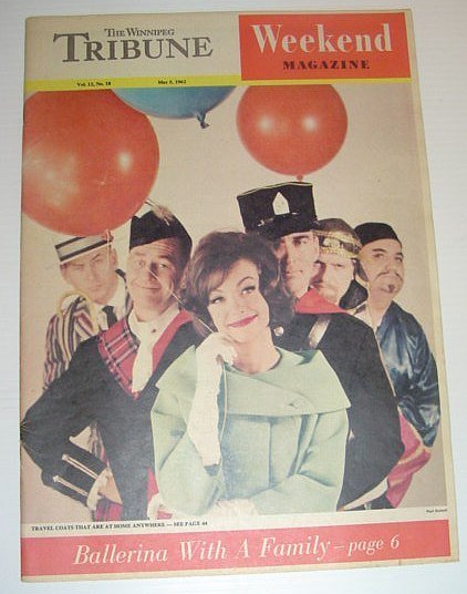 • The Winnipeg Tribune - Weekend Magazine, May 5, 1962 St. Roch sailed into fame - with a crew of eight mounties, she navigated the Northwest Passage - Skipper Henry Larsen, Mom's A Ballerina - Toronto-born Melissa-Hayden deftly runs home, and career, Marsh where the shy swans rest - the peace of Lake Erie beckons, to whistlers after their long trip, Camp of Despair in the Congo - UN Soldiers patrol the camp which, houses 50, 000 Balubas at Elisabethville - graphic photos, Susannah York - a star in the making, Swedes fight to stay neutral - their plan for survival calls for, compulsory military training and enormous blast shelters, Beauty and the Beasts - English gals volunteer for amazing, stunts with elephants, Major League Baseball in Canada - Walter O'Malley of the Los, Angeles Dodgers tells us how to get it (colour photo of O'Malley, shows him with Emil "Buzzie" Bavasi, father of Peter Bavasi who later became the first G.M. of the, Toronto Blue Jays), Nipper by Doug Wright. Canadian History Magazine Back Issues