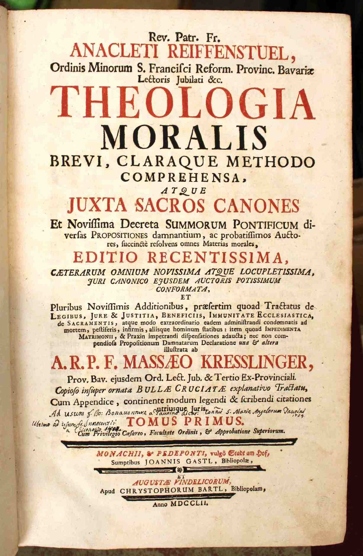 Theologia moralis brevi, claraque methodo comprehensa, atque juxta sacros canones, et novissima decreta summorum pontificum diversas propositiones damnatium, ac probatissimos auctores. Editio recentissima, caeterarum omnium novissima atque locupletissima, juri canonico . Pluribus additionibus, praesertim quod tractatus de legibus . illustrata ab r.p.f. Massaeo Kresslinger. (Con:) Supplementum ad theologiam moralem . continens succintam declarationem propositionum damnatorum