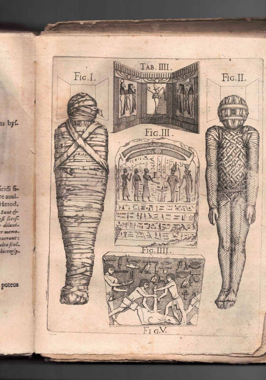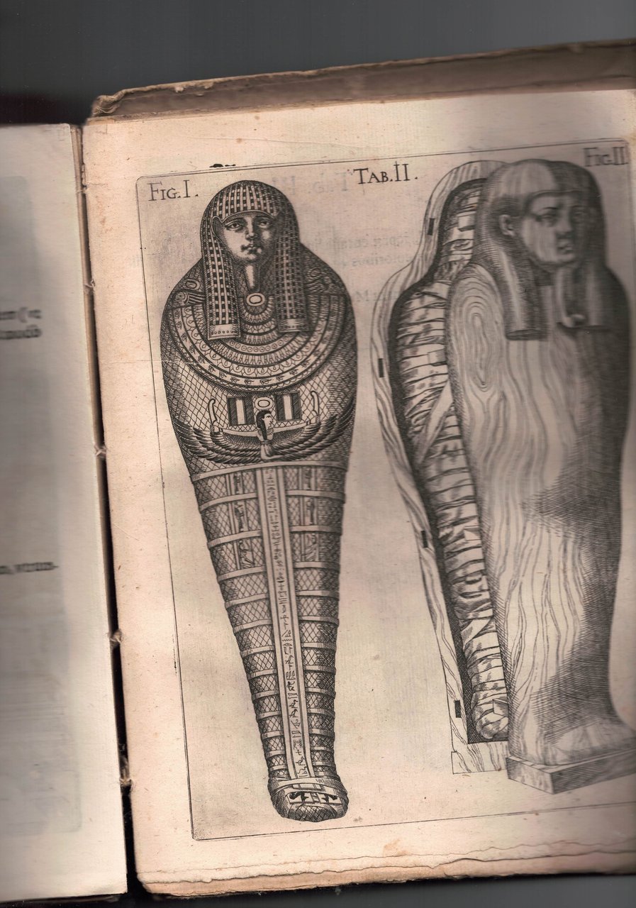 In 4° brossutra lenta ,5 cc.nn.,1 c.b.,680 pp., 9 incisioni raffiguranti figure egizie. Mende al dorso.