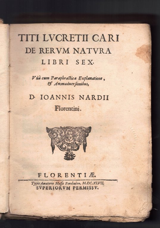 Titi Lucretii Cari De Rerum Natura libri sex una cum paraphrastica explanatione e animaduer sionibus D.IOANNIS NARDII Florentini