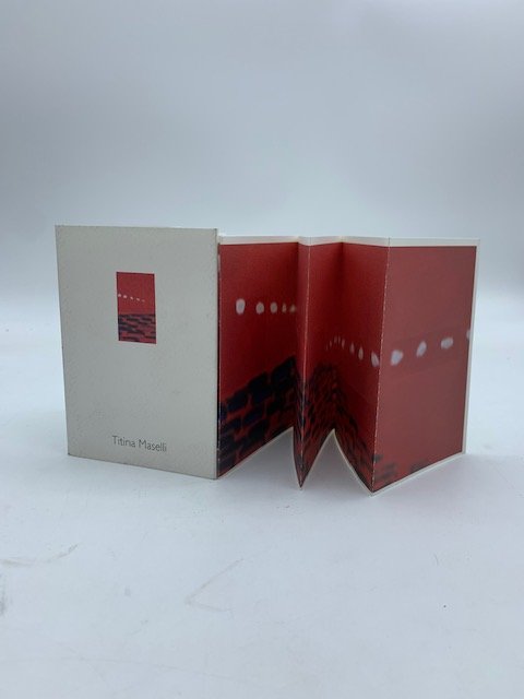 cm 8 x 11,5, brossura editoriale con piccola illustrazione al piatto anteriore a colori, a grandezza francobollo, dell'opera poi riprodotta internamente, al piatto posteriore il colophon con piccolo logo dell'editore, creato da Giosetta Fioroni, una mano che regge tra pollice e indice un cuore, nome del curatore - Andrea Franchi - e del fotografo - Fabrizio Ceccardi - data di stampa e tiratura di questo libro d'artista (edizione di 500 esemplari fuori commercio). All'interno pieghevole a fisarmonica di 10 falde, al recto riproduzione a colori dell'opera di Titina Maselli "Tramonto urbano", al verso sono incollate alcune pecette bianche con testo dattiloscritto in nero tratte da un'intervista dell'agosto 1990 dell'astista a Vincenzo Strata, docente di Fisiologia all'Universita' di Torino.