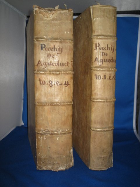 4 parti in 2 voll. in-folio (344x225mm), pp. 4, (12) di indice, 252, (42) di indice bicolonne; (16), 336; legatura coeva p. pergamena rigida con titolo manoscritto in antico su dorso a 4 nervi rilevati. Testatine, capilettera e finalini ornati incisi in xilografia. Numerose incisioni xilografiche, sia intercalate n.t. che f.t., alcune delle quali ripiegate o incise su doppio foglio, con raffigurazioni di corsi fluviali e di opere di idraulica. Testo bicolonne. Qualche sporadica gora e fioritura. Bell'esemplare. Seconda edizione della prima e della seconda, prima edizione della terza e della quarta parte (il primo libro non reca l'anno di stampa al frontespizio, ma è del 1707; il secondo reca l'indicazione del 1707; il terzo è nell'edizione originale del 1681, dello stesso stampatore, mentre il quarto, anch'esso in edizione originale, ['nunc primum in luced editum'] è del 1686) della più importante opera di diritto delle acque del XVII secolo, monumentale trattato sugli acquedotti, i canali ed i corsi d'acqua, la regolazione dei fiumi, l'idraulica, i trasporti fluviali, i laghi, ecc., pubblicato sotto gli auspici del Senato di Milano. Dell'opera (la cui edizione originale apparve tra il 1670 e il 1686) largamente si avvalse Gian Domenico Romagnosi nei suoi trattati intorno Alla ragione civile delle acque e da essa fece iniziare il moderno diritto delle acque il noto giurista Sebastiano Gianzana. Il Pecchi, o Pecchio (Battuda, Pavia, 1639-Pavia, 1692) fu professore di diritto canonico a Pavia dal 1659 al 1687 ed Arcidiacono della Cattedrale pavese, nella quale è sepolto; il suo nome ha rinomanza nella storia della giurisprudenza soprattutto in quanto padre della moderna legislazione sulle acque con il presente trattato e per l'altra sua estesa opera 'Tractatus de Servitutibus in genere'. Questi è per me il vero inauguratore del giure sulle acque. Fu egli invero che radunò i materiali sparsi nei varii statuti, nelle singolari decisioni dei giureconsulti e dei magistrati municipali e collegandole in un sistema. Disciplinò i rapporti nascenti dalle acque in modo che linteresse particolare avesse il suo tornaconto, il sociale conseguisse il suo scopo. [leggendo le opere di lui] ciascuno potrà a meno di ammirare la potenza di quella mente, la quale nel dubbio difficilmente errò, gettandosi facilmente nel lato ove stava il senno comune. (Gianzana). Fontana, Bibliotheca Legalis, II, 68-69. Riccardi, II, 254: 'Emporio ricco, ma poco ordinato, di cognizioni utili al giureconsulto ed al tecnico relative alla scienza delle acque'. Sapori, I, 2272. Sotheran, First Supplement, 6874: 'Rare'. Cfr. Mariano Mariani, F. M. P., Pavia, 1898. Mixed copy of the first and second editions. Complete.