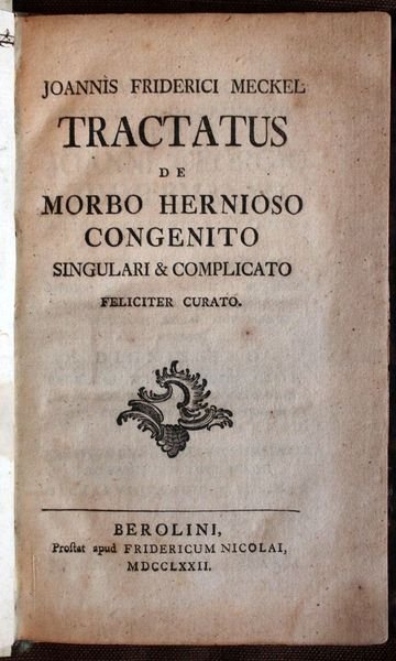 In 8°, pp. (8), 148. Leg. del XIX secolo mezza pergamena (dorso muto). Tagli rossi. Johann Friedrich Meckel il Vecchio, uno dei più brillanti allievi di Haller, fu professore di anatomia, botanica e ostetricia a Berlino. Nel 1773 divenne membro dell'Accademia Reale Svedese delle Scienze. Prima Edizione. Cfr. Blake 296; Hirsch IV, 188.