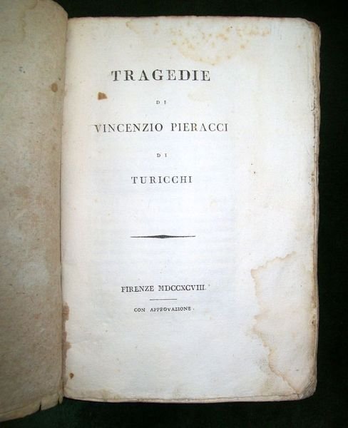 In 8°, pp. IX, (7), 249, (3 b.). Brossura muta dell'epoca con carta decorata a stelline blu su sfondo ocra (cuffie rinforzate con carta ocra). Un alone di umido al margine delle prime due carte. Copia in ottimo stato. Contiene: 'La Sorismonda', 'Valentiniano'; 'La madre maccabea' e 'L'Almeone'.