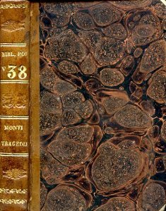 Iin-24°, pp. 215, (1); legatura coeva m. pelle marrone con titolo, fregi e filetti in oro al dorso. Angoli in pergamena, piatti marmorizzati. Tagli a spruzzo azzurri. Qualche fioritura. Manca l'occhietto. Riedizione di tre tragedie montiane 'Aristodemo', 'Caio Gracco', 'Galeotto Manfredi') nella 'Biblioteca Popolare' del Pomba. Delle tre tragedie, la più impotante è riuscita è senz'altro l'Aristodemo', primo lavoro teatrale del Monti, che fu dapprima recitato privatamente a Roma, con l'autore nella parte del protagonista e la sua futura moglie, Teresa Pikler, allora sedicenne, nelle vesti di Cesira. Goethe, presente alla recita privata a Roma, giudicò molto favorevolmente il lavoro, al quale accenna nell'Italienische Reise'. La prima rappresentazione pubblica avvenne al Teatro Valle di Roma il 16 gennaio 1787, ancora alla presenza di Goethe. Bustico, n. 68.