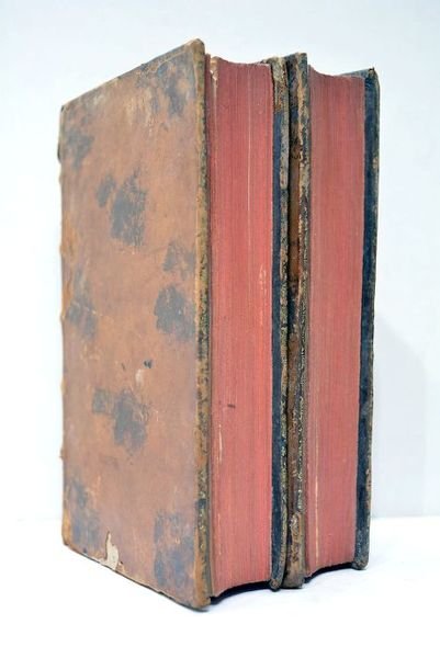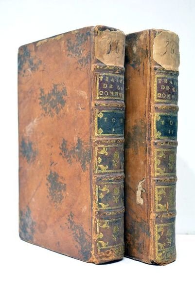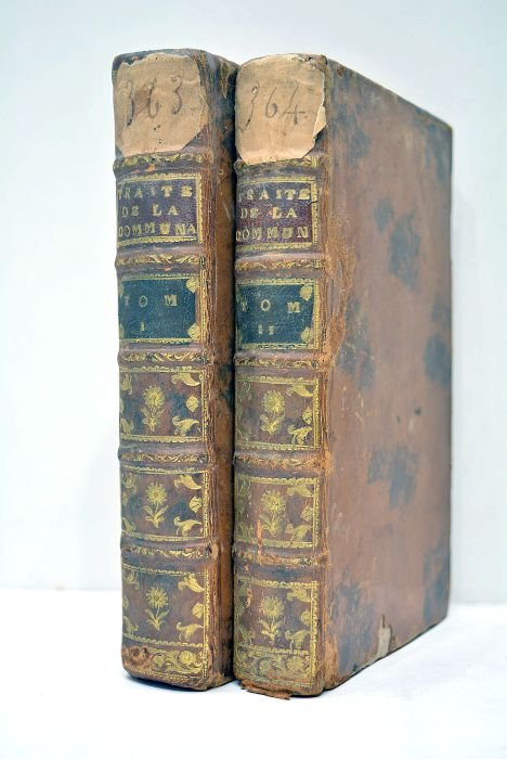 2 volumes in-12. XII. 96 pages. 499 pages. + XII. 525 pages. (17,5x10,5cm). Plein veau marbré de l'époque. Dos à nerfs orné avec pièce de titre et de tomaison de maroquin rouge et vert. Etiquettes anciennes collées sur le caisson supérieur de chaque volume. Roulette sur les coupes. Tranches rouges. Gardes de papier marbré. Coins et coiffes émoussés. Petits défauts aux coiffes et aux dos. Plats un peu frottés avec 2 petits manques de cuir au tome 2 (ver?). Quelques feuillets brunis et salis. Quelques traces de mouillure. Petites rousseurs. Assez satisfaisant. Pierre-Joseph Pothier (1699-1772), "conseiller au présidial d'Orléans sa patrie, et professeur en droit de l'université de cette ville, mourut après avoir consacré toute sa vie à la jurisprudence. Un goût particulier le porta d'abord vers le droit romain; il s'attacha ensuite au droit français, et nous avons de lui un très grand nombre d'ouvrages, qui prouvent qu'il possédait l'un et l'autre". (cf. Feller). "Mais c'est par ses traités sur les obligations, le contrat de vente, le contrat de bail, le contrat de la société, les prêts de consomption, les contrats de dépôt et de mandat, le contrat de nantissement, le contrat de mariage, la communauté, les donations entre mari et femme qu'il inspira les auteurs du Code civil". (cf. Larousse). Sur le mariage: de l'autorisation du mari et ce qu'il convient de faire pour les femmes: marchandes publiques, celles dont le mari a perdu l'état civil, celles dont le mari est tombé en démence, celles dont on ignore ce qu'est devenu le mari, etc. Assez bon exemplaire, solide, relié à l'époque.