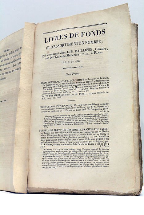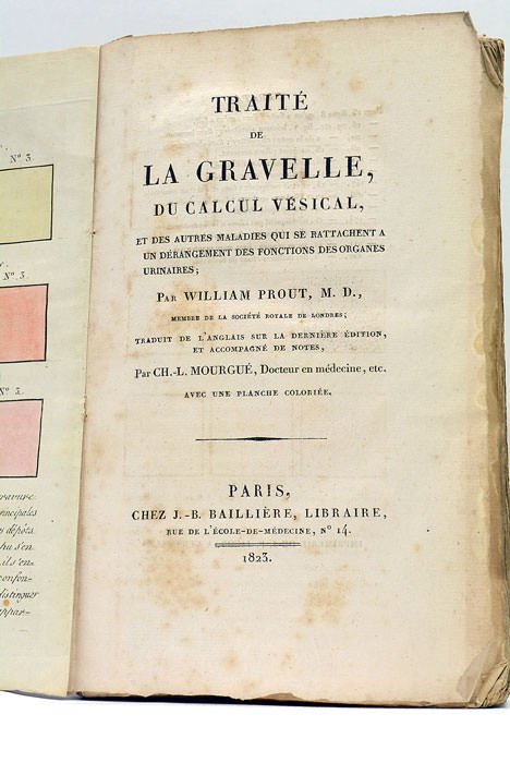 XXX. pages 10 à 312. 1 planche hors-texte. (21x13 Cm). Broché, couverture muette de l'époque. Le Traité de la Gravelle, du Calcul Vésical et des autres maladies qui se rattachent à un dérangement des fonctions des organes urinaires de William Prout est un ouvrage médical de référence, traduit de l'anglais sur la dernière édition et accompagné de notes par Ch.L. Mourgue. Publié en 1822 par Baillère à Paris, ce livre aborde de manière approfondie les différentes maladies liées aux fonctions urinaires, notamment la gravelle et le calcul vésical. Ce traité est une source d'informations précieuse pour les professionnels de la santé et les étudiants en médecine, ainsi que pour les passionnés de l'histoire de la médecine.