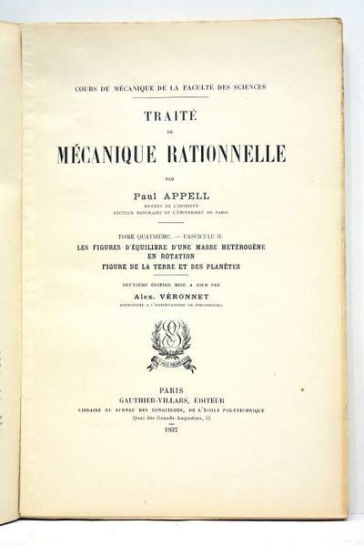 Traité de mécanique rationnelle. Tome quatrième, fascicule II. Les figures d'équilibre d'une masse hétérogène en rotation. Figure de la terre et des planètes. Deuxième édition mise à jour par Alex Véronnet, astronome à l'Observatoire de Strasbourg.