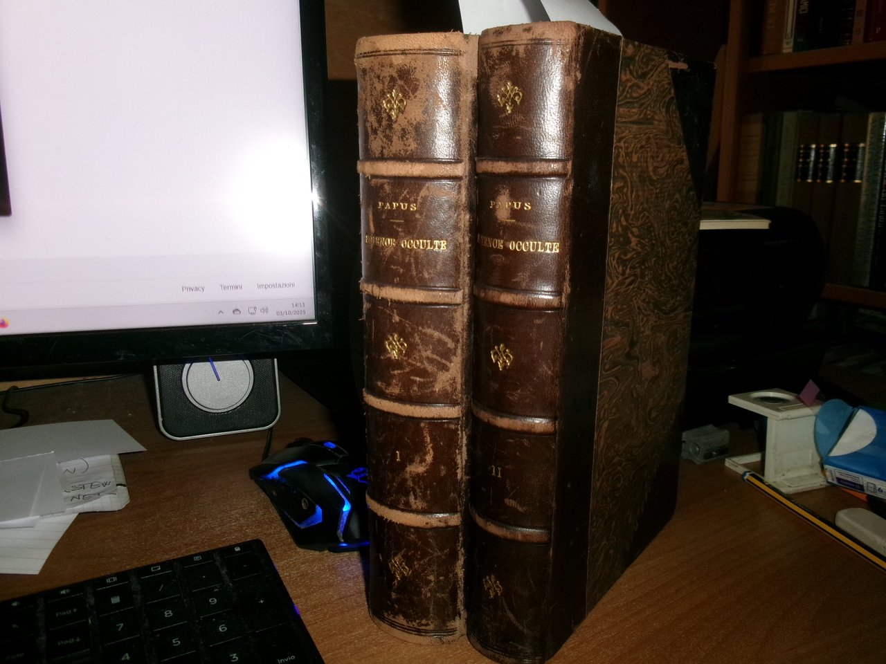 PAPUS (Dr. Gérard Ecausse). Paris, Dorbon-Ainé, s.d. (1928). Traité méthodique de science occulte. Lettre-préface de Ad. Franck. 2 volumi in-8°, m. pelle con grandi angoli, dorso a nervi, copertine originali conservate. xxxvi, 1092 pp. con 400 illustrazioni n.t. e 3 tavole f.t. Seconda edizione conforme all' originale del 1891. che era divenuta introvabile. << Il faut rénoncer à décrire comme il mériterait ce magnifique monument de l' Occultisme contemporain. C' est une véritable encyclopedie de tout ce qui touche aux Sciences magiques: Kaballe, Théosophie, Spiritisme, Alchimie, Franc-Maçonnerie, Arts Divinatoires: tout en un mot, s' y trouve. C' est la base de toute Bibliothèque Magique moderne >> (Caillet, 3612). Dorbon, 3517.