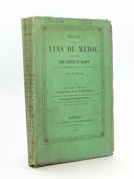 Septième édition, augmentée d'un supplément et accompagnée d'un grand nombre de vues de châteaux du Médoc et autres, d'une Carte du département de la Gironde, de deux Cartes donnant la classification des Vins rouges et des Vins blancs et de divers tableaux synoptiques, 1 vol. in-8 br., P. Chaumas, Bordeaux, 1871, 3 ff. (faux-titre, titre-gravé, titre), VI-404 pp., 1 f. gravé n. ch., 29 pl. hors texte (bois et lithog., la vue du château de Bensse est en double), 2 cartes coloriées, 6 tableaux dépliantes et une grande carte dépliante. Bon état (petite restauration au dos, bel état par ailleurs) pour ce rare exemplaire broché, tel que paru, avec le cachet de l'abbé Dubaquié. L'abbé Dubaquié fut directeur de la station oenologique de Bordeaux, où il succéda à son maître Ulysse Gayon qui, en 1881, sur les suggestions de Pasteur, de Paul Bert, de Jean-Baptiste Dumas et de Berthelot avait monté cette station oenologique pour étudier la fermentation des vins. On le surnomma "le Pape du Vin", dont il était alors le "super-expert" français, européen et mondial. Très belle provenance.