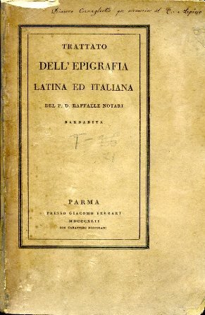 In-8° (220x142mm), pp. XXII, (2), 294, brossura originale marroncina (in parte rimontata) con titolo entro filettature plurime. Dedica a stampa a Carlo Alberto. Una dedica manoscritta del tempo al piatto: 'Giacomo Cornaglietto per memoria al C. Arpino'. Titolo calligrafato al dorso. In barbe, parzialmente intonso, sparsamente fiorito. Edizione originale di questo trattato di epigrafia latina e italiana del barnabita Notari. Il volume è impresso con caratteri bodoniani. 'Per consiglio di dotte e autorevoli persone io posi mano a dettare la presente opera, nella quale seguendo liberamente il Morcelli (De stilo inscriptionum), tentai di dare un trattato quasi parallelo di Epigrafia latina e italiana. Il che ho fatto non tanto per tenermi mezzo tra le antiche e le moderne opinioni e presentare un libro di utile più universale, quanto per formare litaliano epigrafista a quelle classiche scuole latine ed a quei perfettissimi esempi dogni bello, senza ben meditare sui quali, è impossibile il conseguire qualche gloria ancora in questo'. Il Notari fu autore di svariate altre opere di storiografia letteraria e di retorica. Cfr. Luigi Sanvitale, Cenni biografici sul padre Raffaele Notari barnabita, Parma, 1891.
