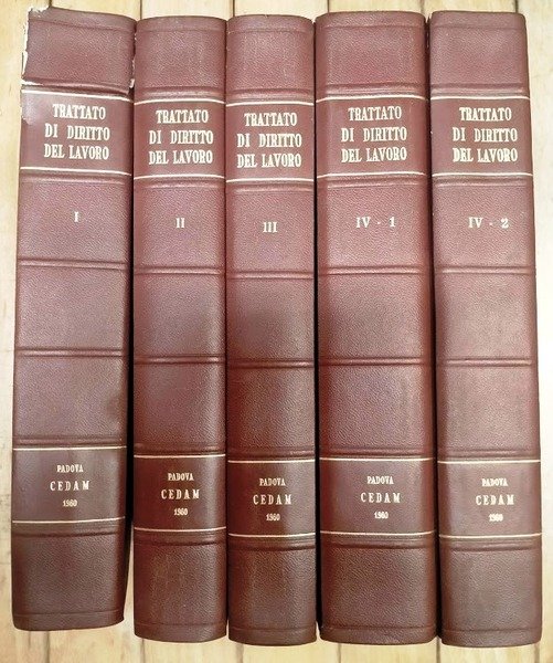 In 8°.Terza edizione 1960. Opera completa di 5 volumi in 6 tomi. Vol.I Introduzione al diritto del lavoro, XVI-670 p., Vol.II Il contratto individuale di lavoro, 626 p., Vol.III La disciplina organizzata del lavoro, 535 p., Vol.IV tomo I e II Le assicurazioni sociali 701-645 p., Vol.V Il diritto del lavoro nei suoi ordinamenti speciali, 474 p., f.to cm 24,5x18, copertina rigida con titoli in oro al dorso. Ottimo stato, adesivo e timbro della biblioteca annullato Collana: -. Cedam, Padova, 1960.