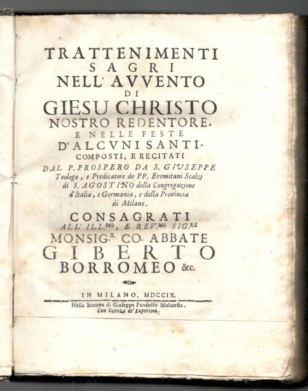 In 4°, pp. (16), 360. Cartonatura dei primi anni del XIX secolo con carta marmorizzata a fondo verde. Dorso con titolo calligrafato su tassello. Porzione del margine inferiore bianco del frontespizio asportata, seza mancanze di testo. Qualche leggera fioritura, per il resto buona copia, a pieni margini.