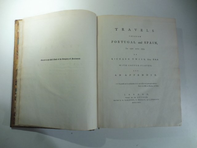 In 4, cm 24 x 30, pp. (4) + IV + 466 + (6) con 1 grande carta fuori testo piu' volte ripiegata (cm 40,5 x 40) incisa da M. A. Rooker e 6 tavole fuori testo incise delle quali 2 piu' volte ripiegate (una grande veduta dell'Alhambra e un'altra raffigurante la teuromachia nella Piazza di Cadice). Tra le tavole e' presente una tavola raffigurnate la Madonna con bambino da Raffaello, incisa dal Bartolozzi. Piena pelle coeva con filettatura ai piatti e dentelle interna. Decori in oro al dorso con nervature e tassello. Edizione originale rara di questa elegante pubblicazione opera di questo scrittore, nato in Olanda, figlio di un mercante inglese. Nel 1772 fece un lungo viaggio in Spagna e Portogallo tornando l'anno seguente. Nel 1774 fu ammesso nella Royal Society e in seguito si diede a studi legati alle belle arti. Palau, 342601