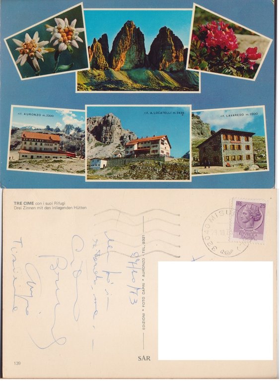 Tre cime con i suoi Rifugi. Viaggiata 1973