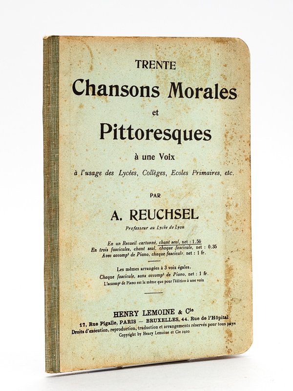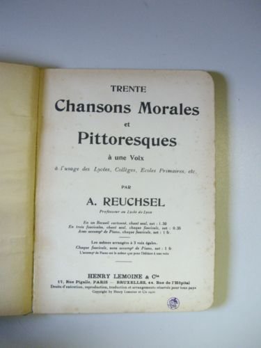 1 vol. in-8 cartonné, Henry Lemoine et Cie, Paris - Bruxelles, 1910, 48 pp. Etat très satisfaisant (rouss. sur couv., bon état par ailleurs) pour ce recueil cartonné, avec paroles et musiques. Pour tous les amateurs de chansons populaires et d’ouvrages scolaires anciens. Rare.