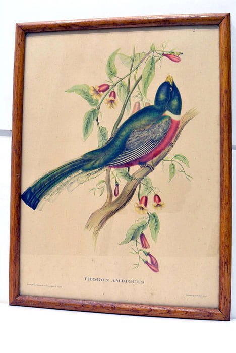 42x31 Cm. Dimension gravure: Environ 39x28 Cm. Cette gravure est une illustration naturaliste réalisée par John Gould, un célèbre ornithologue et artiste du 19e siècle, et son épouse Elizabeth Gould, également talentueuse illustratrice. Le nom scientifique Trogon Ambiguus désigne une espèce d'oiseau trogon, probablement le Trogon ambiguus, également connu sous le nom de Trogon de montagne (Mountain Trogon). Cette gravure provient probablement de l’ouvrage "A Monograph of the Trogonidae, or Family of Trogons", publié par John Gould entre 1835 et 1838. Cet ouvrage est dédié à la famille des trogons, des oiseaux exotiques colorés des régions tropicales d’Amérique, d’Asie et d’Afrique. Cadre simple en bois.