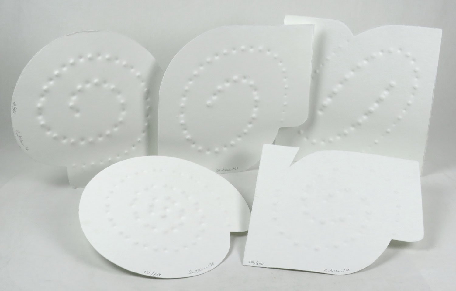 - 5 bifoli sciolti con anta posteriore ripiegata, contenenti ciascuno un oggetto grafico sagomato di Enrico Castellani protetto da doppia velina semitrasparente; 1 bifolio finale di postfazione e 2 bifoli contenitivi sagomati come la brossura. La carta su cui sono impresse le calcografie di Castellani è carta «Etna» della Sicars da 500 grammi, «appositamente sagomata nel corso del 1996 da Andrea Sommavilla in Belluno»; quella per i testi è «Graphia» 130 grammi della stessa cartiera.