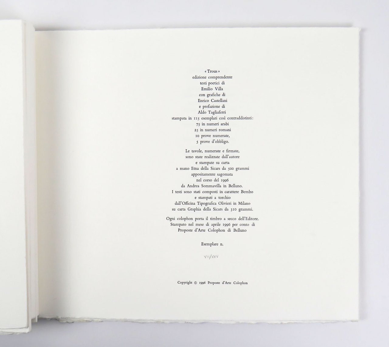 LIBROEdizione originale.CON AUTOGRAFO.Esemplare VIII / XXV, ben completo di tutte le estroflessioni numerate e firmate dall’artista.Opera tirata in soli 115 esemplari in tre serie (1-75, I-XXV, dieci prove numerate e cinque prove d’obbligo) su carte di pregio in barbe, a varia grammatura, della cartiera Sicars. Raccoglie diciotto componimenti inediti di Villa, di cui dieci riprodotti e manuscripto, alternati a cinque «estroflessioni» di Enrico Castellani su carte appositamente sagomate, ciascuna numerata e firmata dall’artista. Postfazione di Aldo Tagliaferri: «I testi dei “Trous” qui raccolti risalgono agli stessi anni in cui Villa scrisse quelli delle “Sibyllae” (1980-1985) e hanno caratteristiche che li accomunano a questi ultimi».