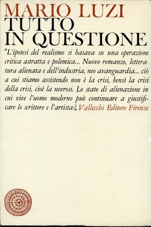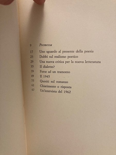 In-8°, pp. 75, (9), brossura editoriale a risvolti paratestuali, titoli a due colori al dorso e al piatto anteriore (impaginazione e grafica di Bob Noorda). La cultura e il tempo, 5. Perfetto esempalre conservante scheda editoriale e acetato protettivo. Prima edizione in volume. Cfr. Spaducci, p. 166. Gambetti-Vezzosi, p. 471: 'Otto saggi critici già apparsi in 'La Chimera', tra il giugno 1954 e il maggio 1955, intervista apparsa in 'Nuovi Argomenti', nel 1962 e premessa inedita'.