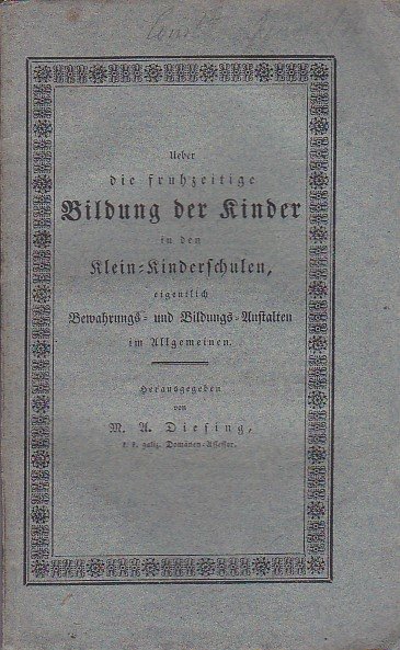 In-8°, pp. 80, brossura editoriale azzurra con titolo entro bordura floreale. Testo in carattere gotico. Perfetta copia a fogli chiusi (fioriture fisiologiche). Unica edizione, assai rara, di questo studio sulla condizione degli asili infantili e dell'istruzione pubblica dei bambini nell'Impero Austro-Ungarico ed in Germania.