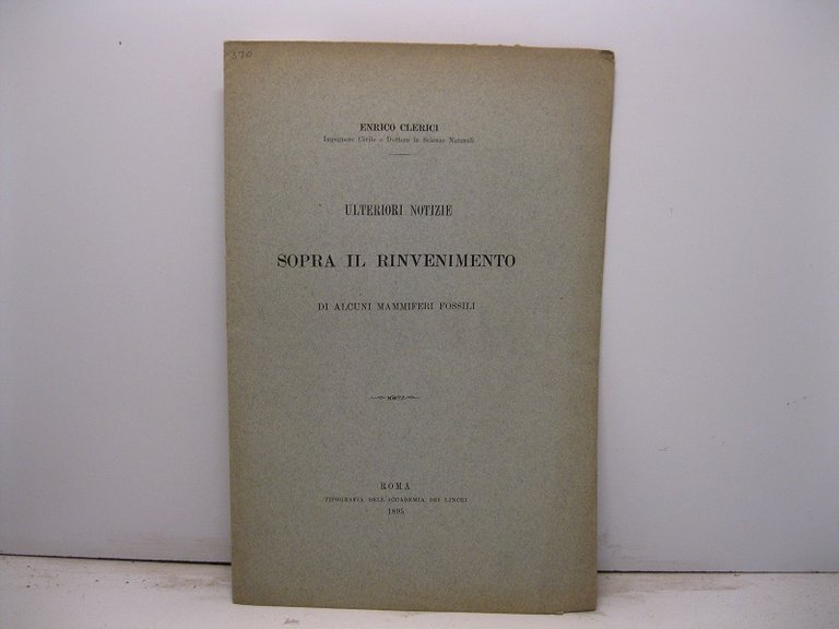 In 8, pp. 11. Br. ed. Alcune aggiunte relative al ritovamento di resti fossili animali  nei dintorni di Roma appartenenti al Castor fiber e dell'Elephas meridionalis.
