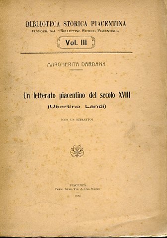 In-8°, pp. VII, 175, (4), brossura editoriale a stampa nera. Dedica autografa dell'autrice al foglio del titolo. Un ritratto di Ubertino landi in b.n. f.t. Intonso, in buono stato. Prima e unica edizione di questo documentato studio sul poeta arcade piacentino Ubertino Landi (da non confondere con l'omonimo capo delle fazioni ghibelline di Piacenza, vissuto invece nella seconda metà del XIII secolo). Con una lettera prefatoria di Stefano Fermi, Direttore della Biblioteca Storica Piacentina. In appendice vengono riprodotte numerose liriche del Landi e si fornisce una bibliografia delle opere da lui composte e degli studi a lui dedicati. Biblioteca Storica Piacentina, III.