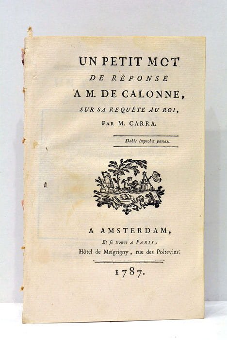 89 pages. 1 planche dépliante. (19,5x12,5 Cm). Dérelié. Publié en 1787 à Amsterdam, cet écrit de Jean-Louis Carra, notable figure de la Révolution française, s'inscrit dans un contexte pré-révolutionnaire tendu. Originaire de l'Ain, Carra, qui trouvera la mort sous la guillotine en 1793, se lance dans une critique acerbe de la gestion financière et politique de Charles Alexandre de Calonne, contrôleur général des finances sous Louis XVI. À travers l'analyse de diverses malversations financières et abus de pouvoir, l'auteur soulève des questions économiques cruciales qui résonnent avec les enjeux contemporains de gestion des biens nationaux et de transparence gouvernementale. Plis et traces de plis. Mouillure claire. Rares taches et rousseurs.