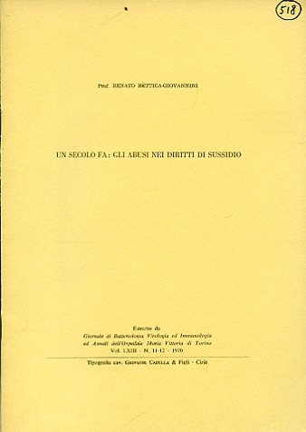 Un secolo fa: gli abusi nei diritti di sussidio. Estratto da: Giornale di Batteriologia Virologia ed Immunologia ed Annali dell'Ospedale Maria Vittoria di Torino. Vol. LXIII - N. 11 - 12 - 1970