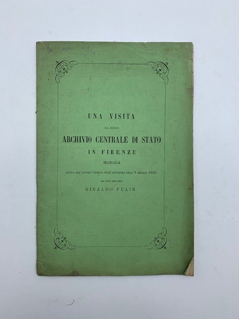 In 8 (cm 15,5 x 23,5), pp. 20. Leggero alone violaceo al margine esterno bianco delle pagine. Brossura editoriale. Estratto editoriale dagli "Atti dell'Ateneo veneto". Saggio di Rinaldo Fulin, storico veneto, in cui indica agli studiosi sia l'Archivio notarile di Venezia sia l'Archivio di Stato di Firenze come luoghi in cui reperire documenti utili come fonti per la storia veneta. Fulin fu il fondatore, nel 1871, insieme ad Adolfo Bartoli, dell'Archivio veneto che continuo' a sostenere da solo quando il Bartoli fu chiamato all'Istituto di Studi superiori di Firenze.