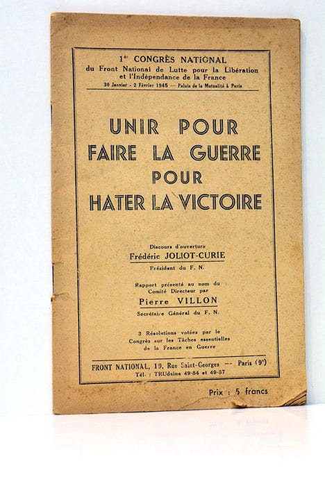 Unir pour faire la guerre pour hater la victoire: 1er Congrès National du Front National de Lutte pour la Libération et l'Indépendance de la France, 30 janvier - 2 février 1945 ; discours d'ouverture Fréderic Joliot-Curie ; rapport présenté par Pierre Villon ; 3 résolutions votées par le Congrès sur les tâches essentielles de la France en guerre.