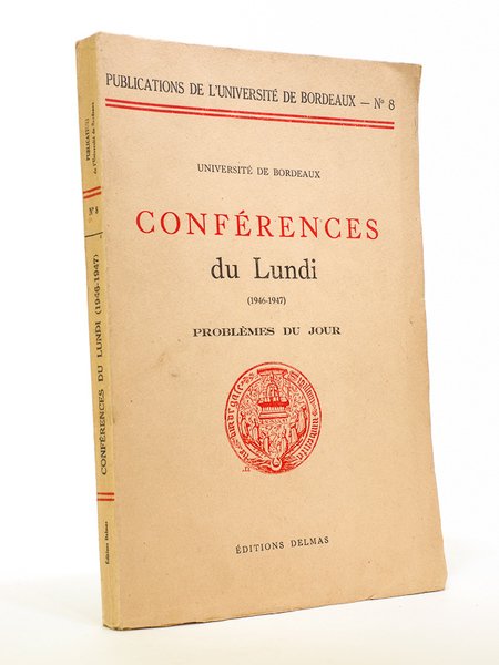 1 vol. in-8 br., Publications de l'Université de Bordeaux, éditions Delmas, 1948, 241 pp. Au sommaire notamment : La quadrature du cercle (Paul Montel) ; Pasteur (Louis Génevoix) ; La naissance de Rome (Pierre Grimal) ; Le Microscope électronique (G. Dupouy) ; Qu'est-ce que la démocratie (Maurice Duverger) ; La vérité ultime dans le nombre entier, de Pythagore à Eddington (Jean Rösch); etc. Bon état. Créées en 1945 par le Recteur Marchaud, de l'Université de Bordeaux, les "conférences du Lundis" étaient des conférences hebdomadaires consacrées aux problèmes d'actualité, qui se déroulaient dans les mois d'hiver. Elles visaient un large public et connurent un grand succès.