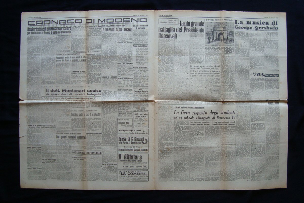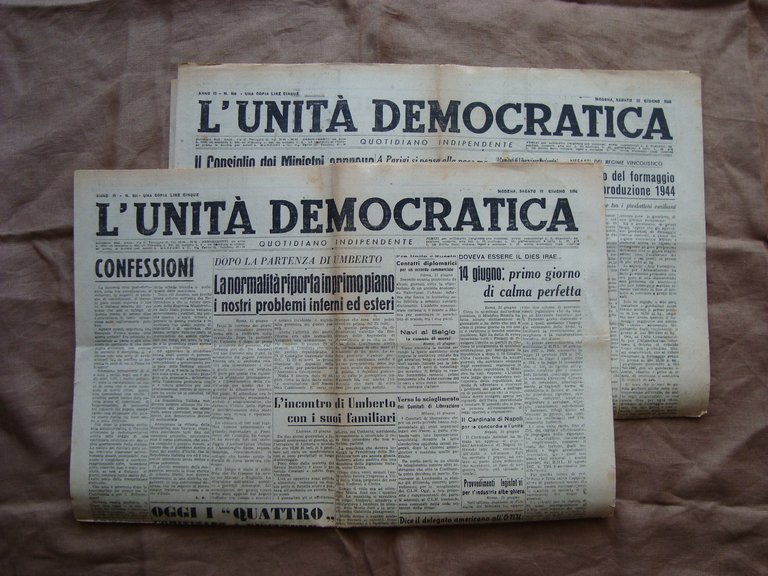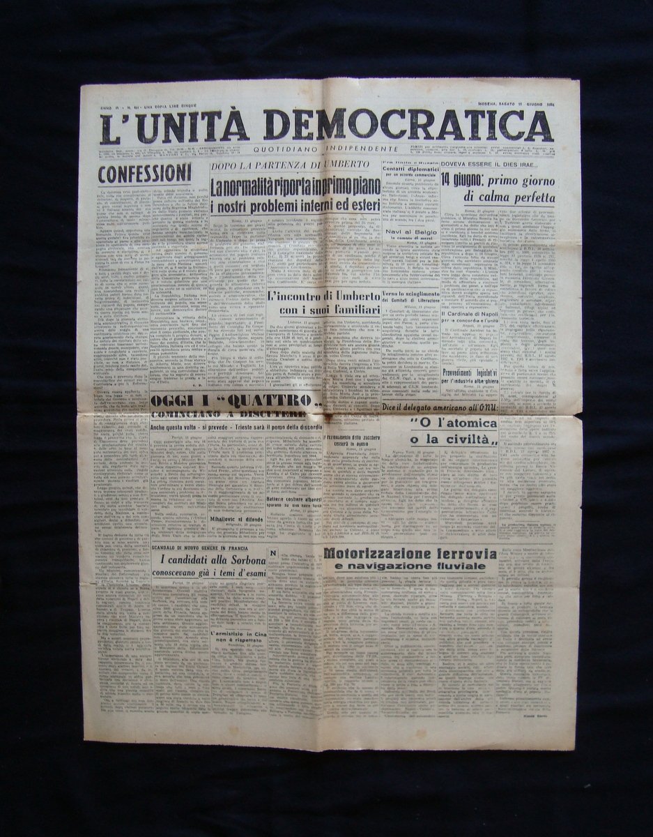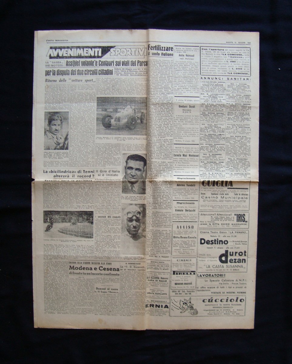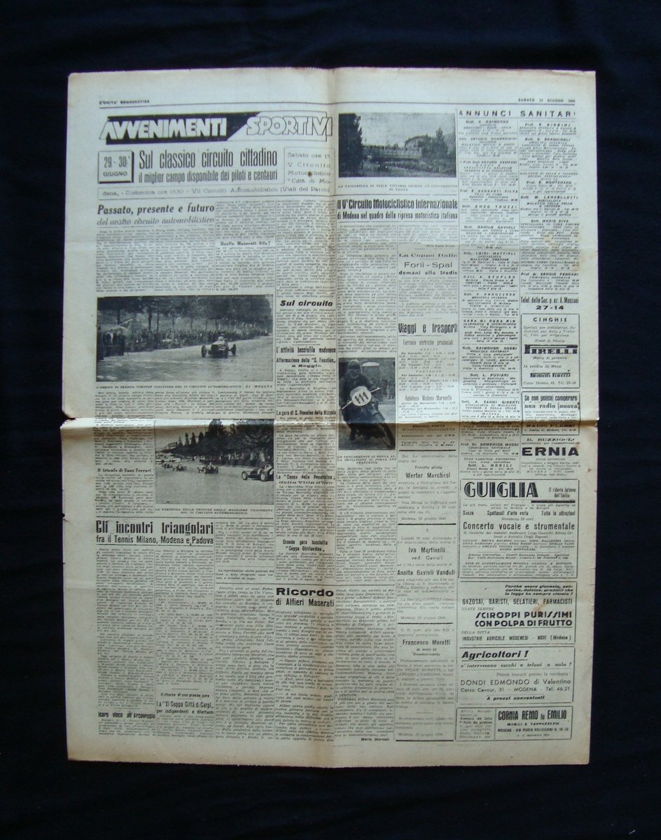 due numeri del periodico, L'Unità Democratica" Quotidiano Indipendente Anno II- N.401 15 Giugno 1948 Alfiero Maserati- Lo "starter" Biondetti Anno II- N.408 22 Giugno 1948 Enzo Ferrari Modena,1948; cm 57x43, pp. 4 (bifolio) cad. con ill fot. b/n Numeri Interi. Condizioni di conservazione Esemplari in buone condizioni con tracce d'uso, pieghe di conservazione che si presentano ingiallite e con piccoli strappetti, leggere bruniture e piccole macchiette; per le condizioni vedi foto. SC03.D14211F blu "