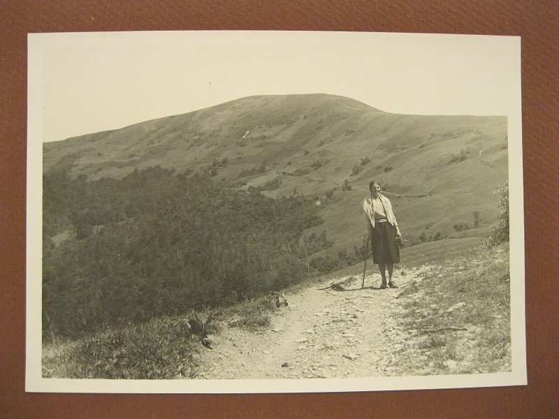 Fotografia originale in b/n vintage, stampa alla gelatina ai sali d'argento, didascalia manoscritta al verso, misura cm 17,5 x 12,5 montata su cartoncino bordato cm 23 x 17, ritrae una donna su un sentiero della Costa dell'Uccellaia del Monte Giarolo. Alle sue spalle svetta il Monte Ebro.
