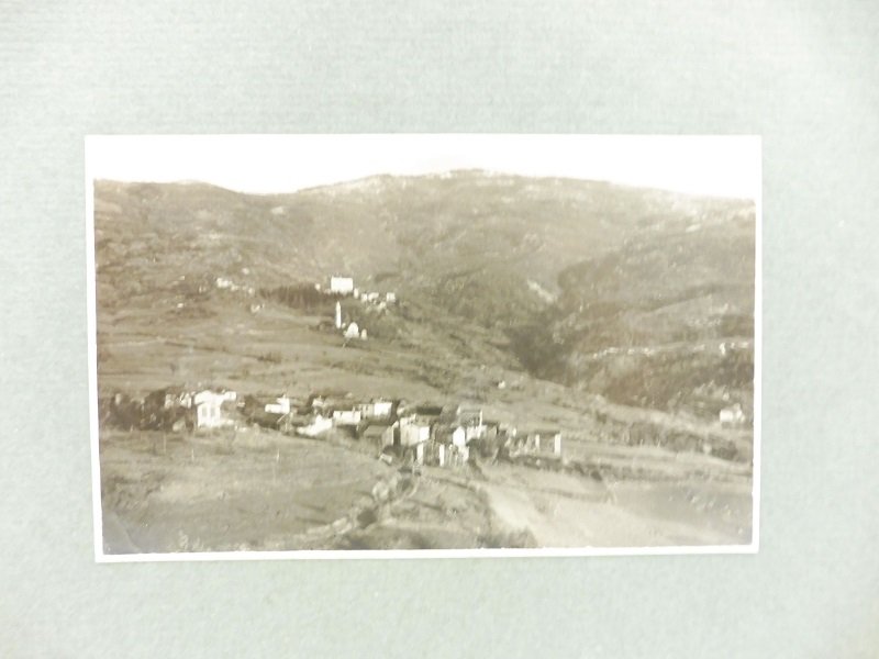 Fotografia originale in b/n vintage, stampa alla gelatina ai sali d'argento, didascalia manoscritta al verso, cm 13,7 x 8,7 montata su cartoncino bordato cm 22,6 x 17, ritrae panorama della val Borbera con il Monte Giarolo e i paesi di Pessinate e Borgo Adorno.