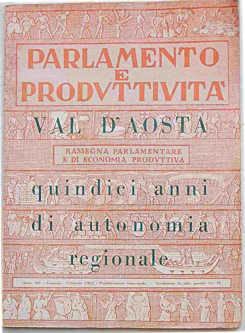 In 4° (cm. 33 x 24); pagg. 112; con numerosis. illustrazioni n.t.; leggera cartonatura originale figurata. Qualche ondulazione della carta per umidità, ma buono. VG- -. ** Numero speciale monografico della rivista "Parlamento e Produttività".