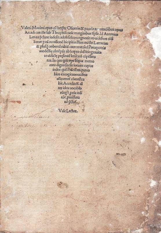 Valerii Maximi opus cu[m] i[n]terp[re]te Oliuerio & paucis annotat[i]o[n]ibus quas Arcadicus ille sub Theophili no[m]i[n]e marginibus i[n]sp[er]sit : id Antonius Lenas p[re]clarae indolis adolesce[n]s recognouit eo uidelicet co[n]silio ut p[er] ea[m] occasione[m] bicipitis illius mo[n]stri latratus & plusq[uam] cerberea[m] rabie[m] coerceret : sed preceptoris modesti[a]e obte[m]p[er]a[n]s ab i[n]cepto destitit grauitate uidict[a]e pr[a]esente[m] lenitate[m] co[m]pe[n]saturus : in quo q[ui]de[m] op[er]e si quae memoratu digna facile i[n]uenire cupis index que[m] Fra[n]ciscus Puteola[n]us excogitauerat sine ullo error[em] co[m]mostrabit : accedit & alter i[n]dex uocabloru[m]q[ue] i[n] p[ro]xi[m]a aedit[i]o[n]e p[er]missus no[n]