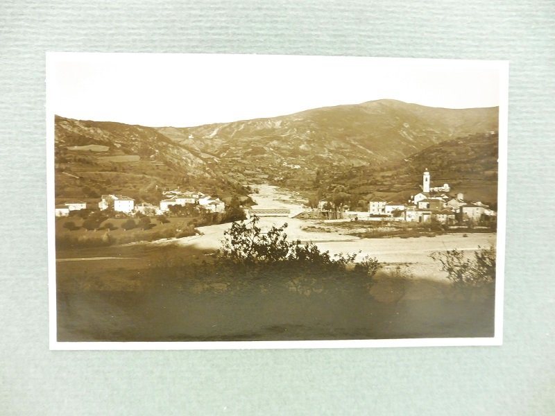 Fotografia originale vintage in b/n, stampa alla gelatina ai sali d'argento, didascalia dattiloscritta al verso, misura cm 14 x 9 montata su cartoncino cm 22,8 x 17, ritrae una veduta del paese di Albera Ligure nella Val Borbera situato sulla sponda destra del Borbera.