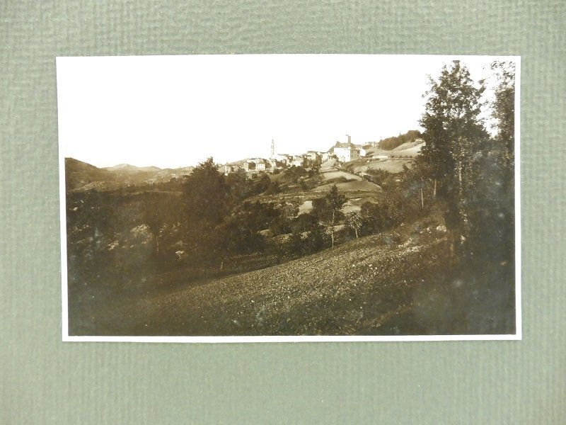 Fotografia originale vintage in b/n, stampa alla gelatina ai sali d'argento, cm 13,7 x 8,5 montata su cartoncino bordato cm 23 x 17, didascalia dattiloscritta al verso, ritrae veduta del paese di Dernice in val Borbera.