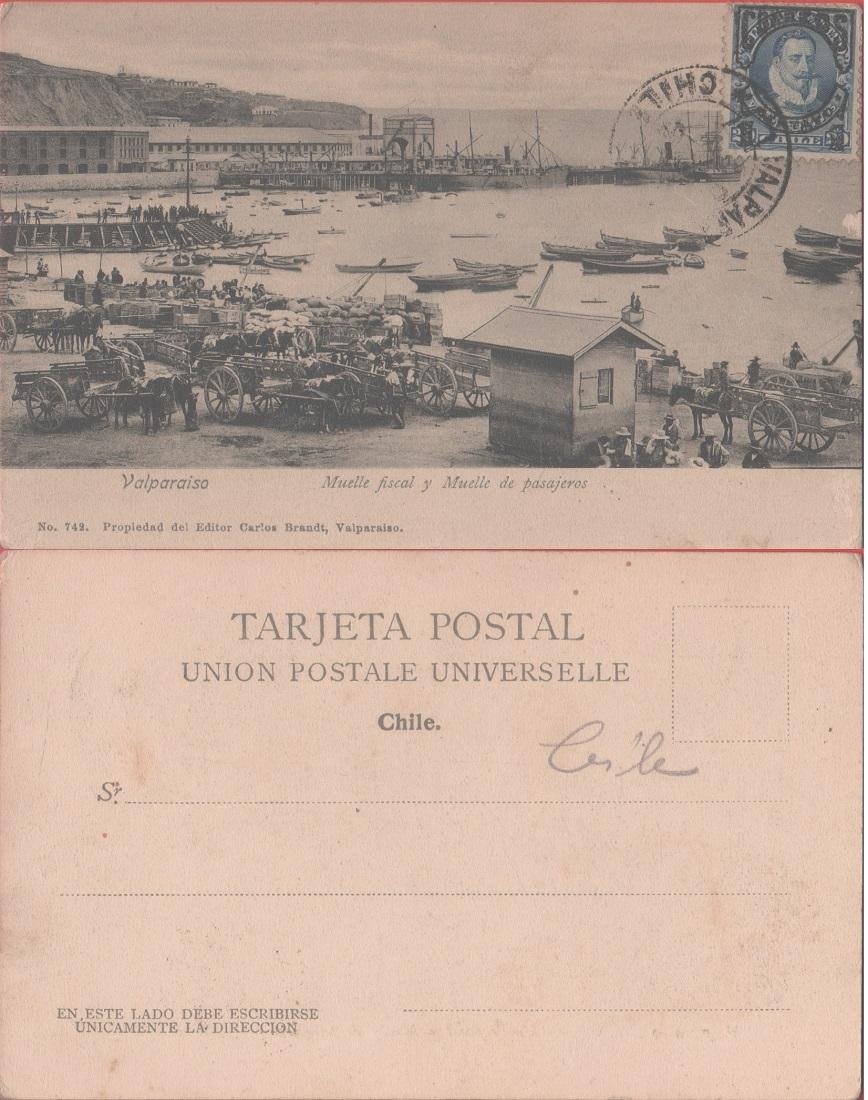 Valparaiso (Cile). Muelle fiscal y Muelle de pasajeros . Viaggiata 1905. Carri, animata