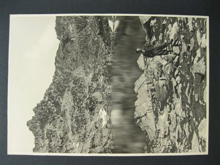 Sedici fotografie originali in b/n vintage, stampa alla gelatina ai sali d'argento, didascalie al verso, montate su cartoncino bordato cm 23 x 32,8, la prima misura cm 14,7 x 10 ritrae un uomo e una donna con un asino e un cane nell'alta val Sorba con il colle di Loo alle spalle; la seconda misura cm 17,7 x 24 e ritrae un uomo in piedi su uno sperone di roccia accanto ad uno dei due laghi superiori dei Tre Vescovi nell'alta val Sorba; la terza, la quarta e la quinta montate su cartoncino bordato cm 23 x 17, misurano cm 17,5 x 12,5 (la terza misura cm 12 x 8,5) ritraggono il Lago Lamaccia e il Monte Bo. La sesta misura cm 14,5 x 10 ritrae una veduta dell'Alpe del Prato e del Colle del Loo; la settima cm 10 x 14,5 ritrae il Lago Lamaccia; l'ottava misura cm 14 x 10,2 ritrae il lago superiore dei Tre Vescovi; la nona misura cm 10,3 x 14 ritrae un panorama dalla cima dei Tre Vescovi; la decima misura cm 17 x 12,5 ritrae un uomo sulle sponde rocciose del lago inferiore dei Tre Vescovi; l'undicesima cm 12 x 16,5 montata su cartoncino bordato cm 24,5 x 33,5 ritrae il Lago Inferiore dei Tre Vescovi e sul fondo il Monte Bo; la dodicesima e la tredicesima cm 10,5 x 14 e 10 x 11,8 ritraggono due vedute del lago inferiore dei Tre Vescovi; la quattordicesima cm 17 x 23,5 ritrae una donna sulle rive del piccolo lago a valle dei Laghi dei Tre Vescovi con il M. Bo sul fondo; la quindicesima cm 12,5 x 17 ritrae il Lago Inferiore; la sedicesima cm 10 x 15 ritrae un uomo sulle sponde del lago superiore.